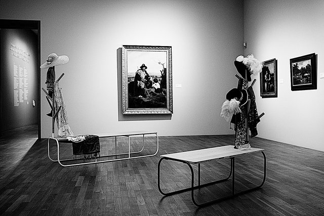 Einige Angebote wirken jedoch etwas unbeholfen. So soll das Erfahren der Kindheit im 17. Jahrhundert etwa durch das Tragen eines Federhutes nachvollzogen werden. Der Blick auf das Gemälde Pieter Nasons’ Porträt eines Jungen als Jäger, gemalt um 1670, gibt einem eine Ahnung, wie solch ein Knabe ausgesehen haben mag. An zwei Kleiderständen in der Mitte des Ausstellungsraumes kann man sich einen Hut aufsetzen und selbst austesten, wie sich mit der Kopfbedeckung die Perspektive auf die Gemälde verändert. An einer der Erfahrungsstationen werden die Besucher dazu angehalten, Selfies zu machen. An einer Wand hängen bereits erste kleinformatige Polaroidbilder. In einem Rahmen lassen sich einige Bilder verschieben, sodass man sie durch das Milchglas vergrößert sehen kann. Im Untergeschoss am Eingang zum vierten Raum „Innenraum und Perspektive“ kann man sich ein Video in vier Sprachen mit Untertiteln, darunter auch in Portugiesisch, ansehen. In der Mitte stößt man auf ein Taktilmo-