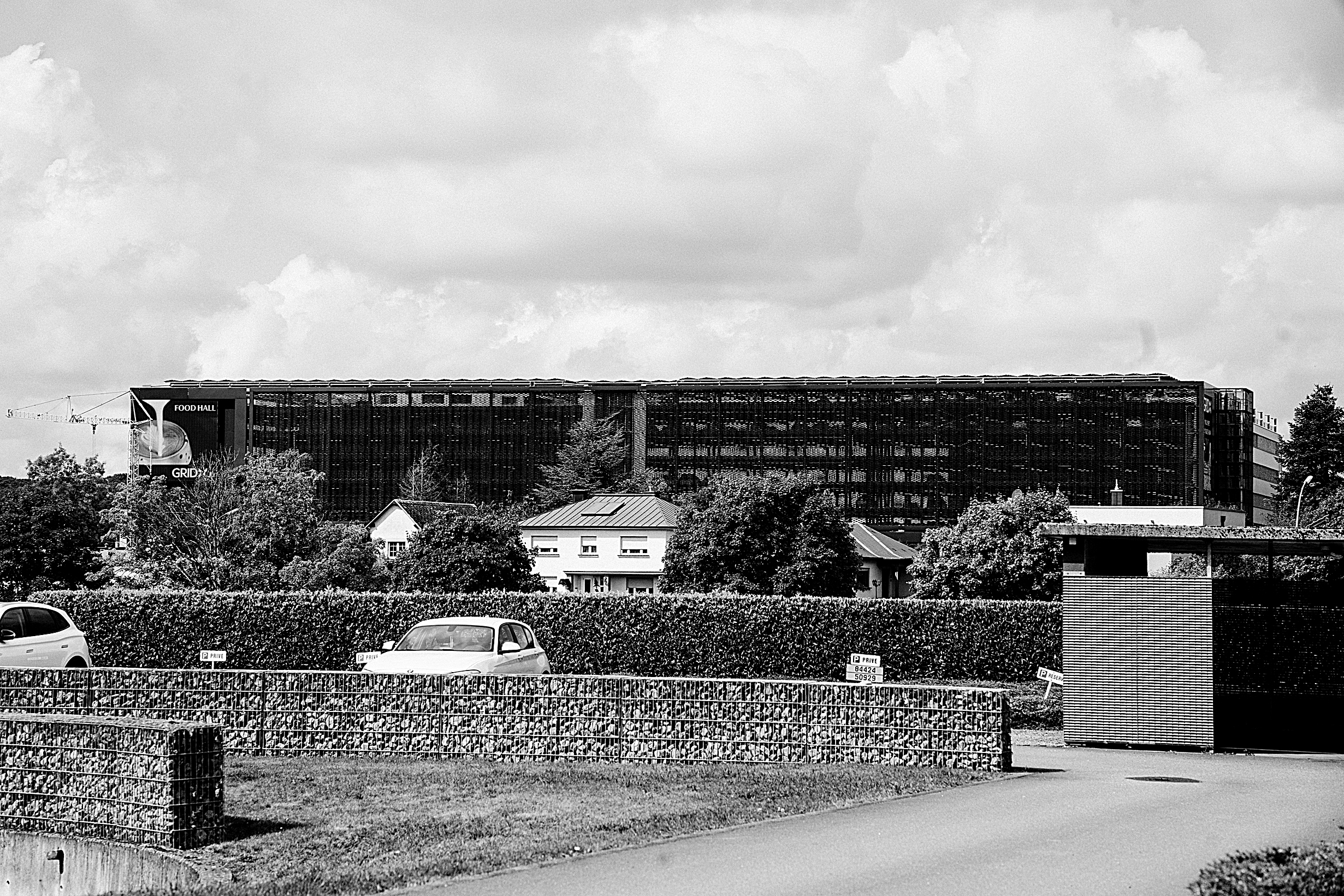 L’A4 surgit du Leidelenger Besch, déroule ses courbes entre collines, haies et pavillons, longe les fermes de Mondercange avant de disparaître derrière Foetz, mère des zones commerciales. Puis, rupture : à Pontpierre-Wickrange, face à des petites maisons pavillonnaires, surgit un socle de quatre niveaux, une tour de quatorze, une barre de dix. Par canicule, l’ensemble vibre comme un mirage. Apparaît un remix des boîtes commerciales et industrielles de Foetz, mais agrandi, densifié, comme si l’échelle avait soudain changé de régime.
