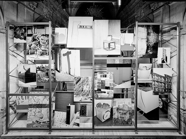 L’installation happe le regard par les couleurs saturées et vives voulues par l’artiste qui est aussi imprimeur et graphiste. L’ensemble aboutit ainsi à des scènes presque abstraites où, par leur arrangement, les images entrent en dialogue entre elles : un mur carrelé côtoie une grille, un ciel bleu se colle à un mur azur, une chaise et une étagère semblent du même bois. Elles se confrontent aussi au cadre de l’exposition : Les plaques de marbre photographiées font écho aux marbres peints de la chapelle, des tubes métalliques d’échafaudage en image rappellent ceux utilisés pour le support lui-même. D’autres photos sont posées sur des petits chariots amovibles rappelant les trolleys de magasins de meubles, comme si ces photos allaient être acheminées vers un autre endroit, un stock, un rebut, une décharge.