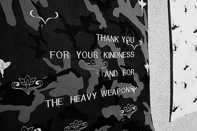 Cette approche se retrouve chez Cristina Picco, qui se confronte à la violence en brodant des représentations d’équipement militaire. Sur un carré de tissu, elle festonne par exemple des anges aux côtés d’hélicoptères de combat. Son travail véhicule avec ironie la violence d’une réalité militarisée, amplifiée par une surveillance démesurée. Une réalité qu’elle choisit d’inscrire sur une surface organique et élémentaire. Peut-être est-ce précisément parce que cette violence est omniprésente, consommée frénétiquement, qu’elle pourrait aussi être délicatement brodée sur un t-shirt, au point de susciter l’envie de l’« ajouter au panier ».